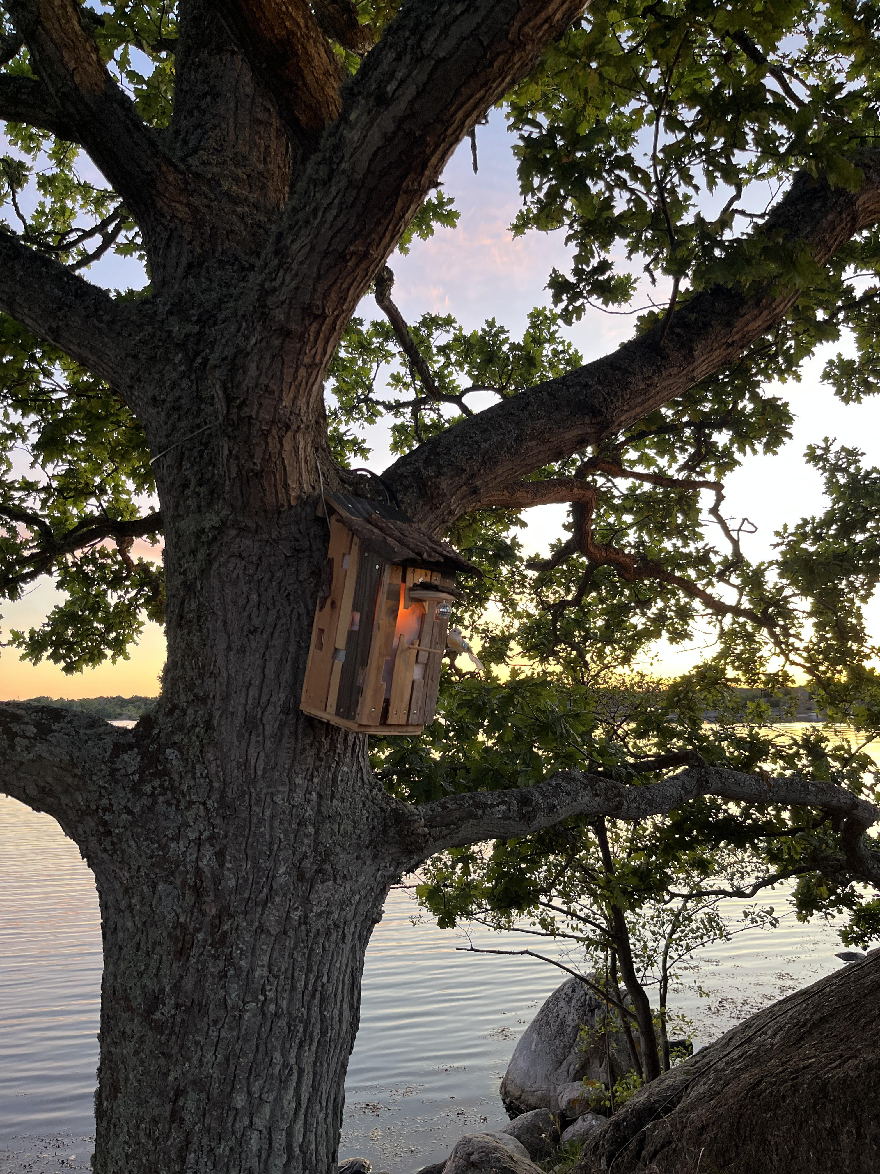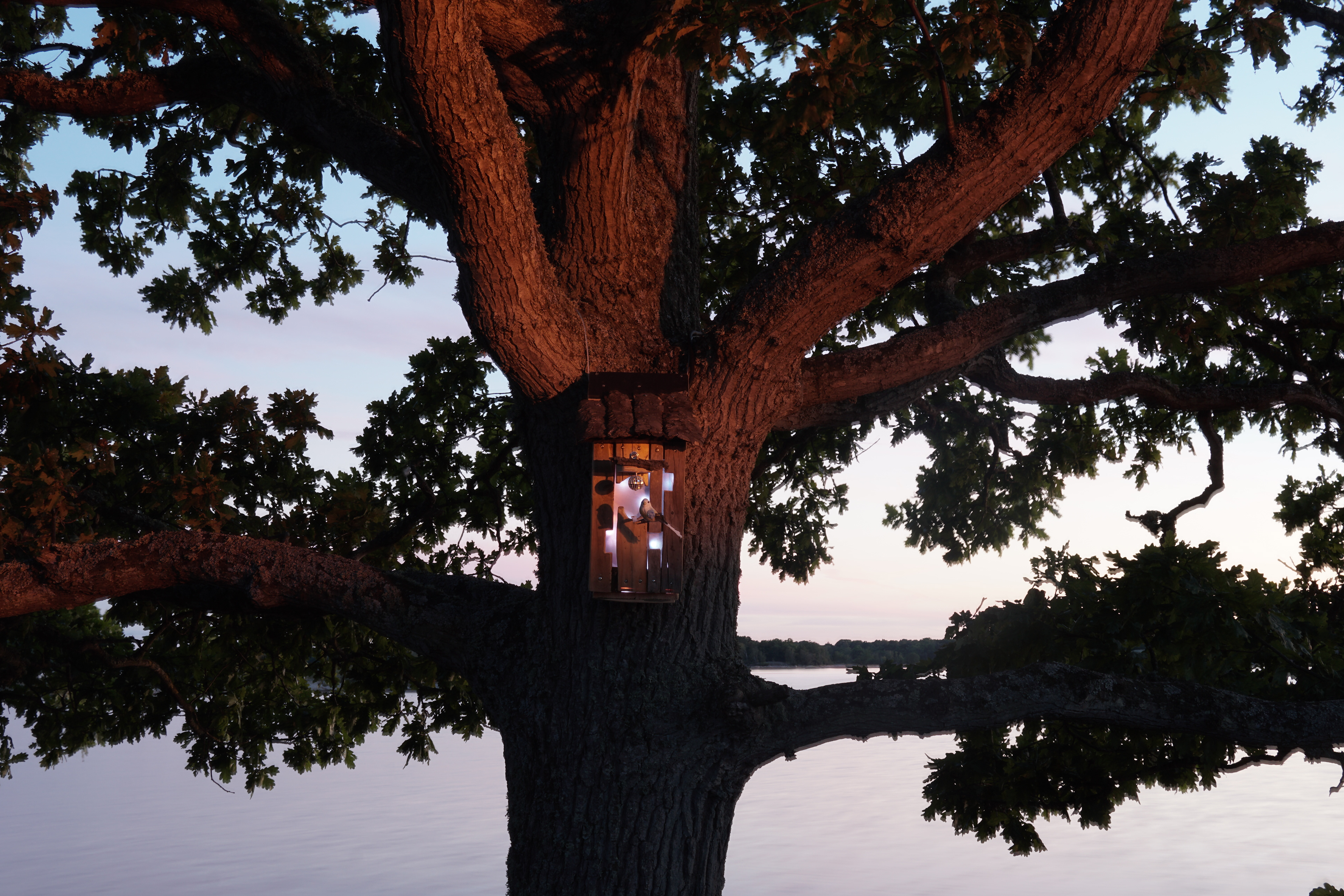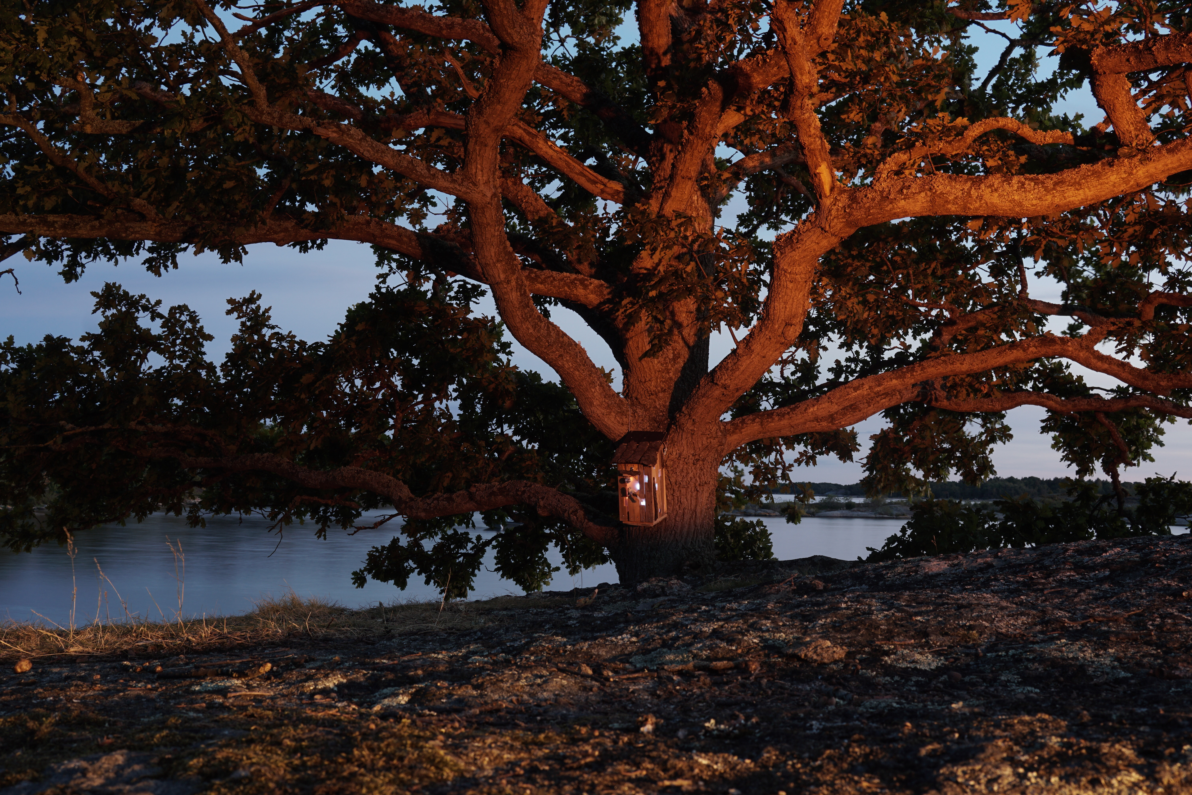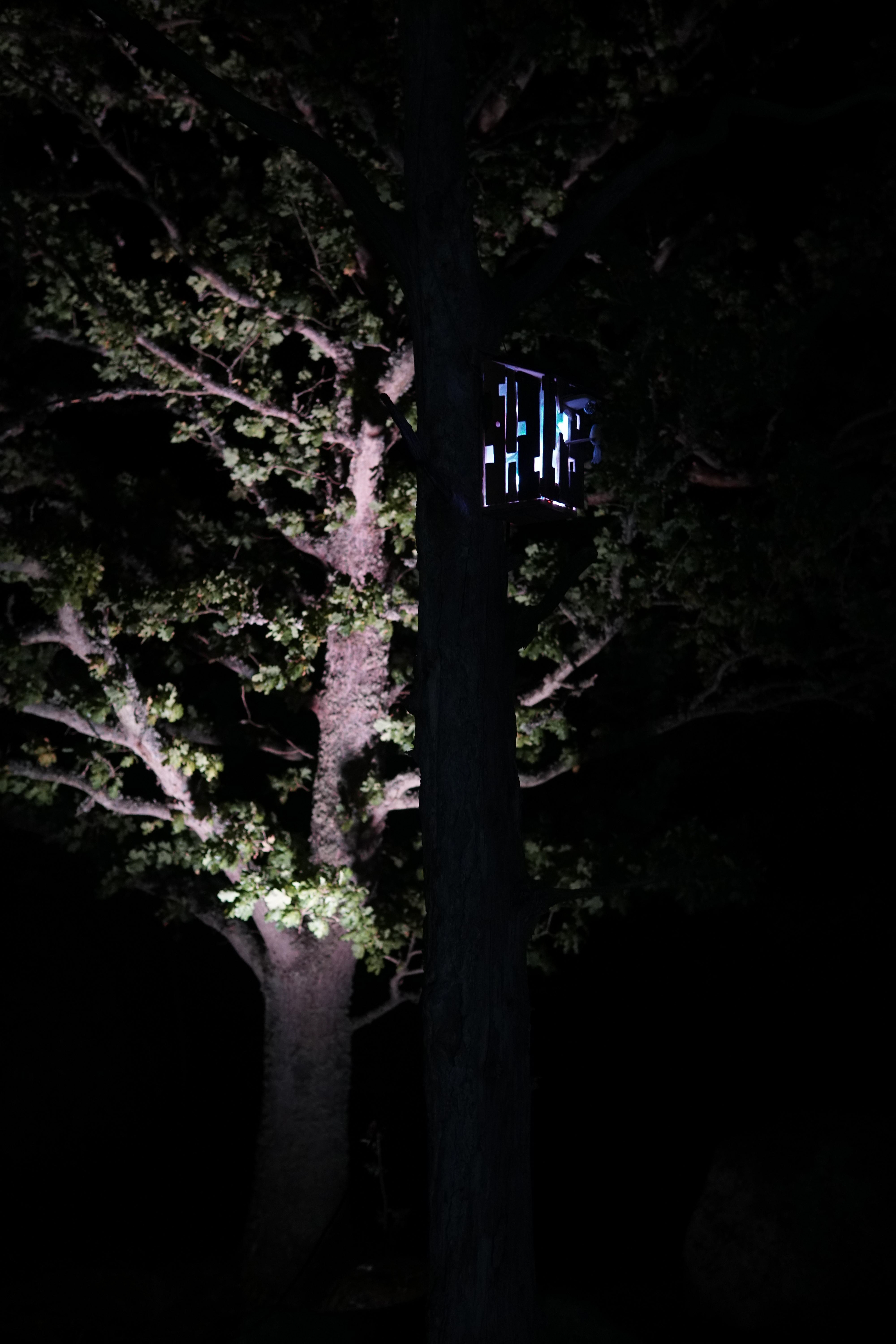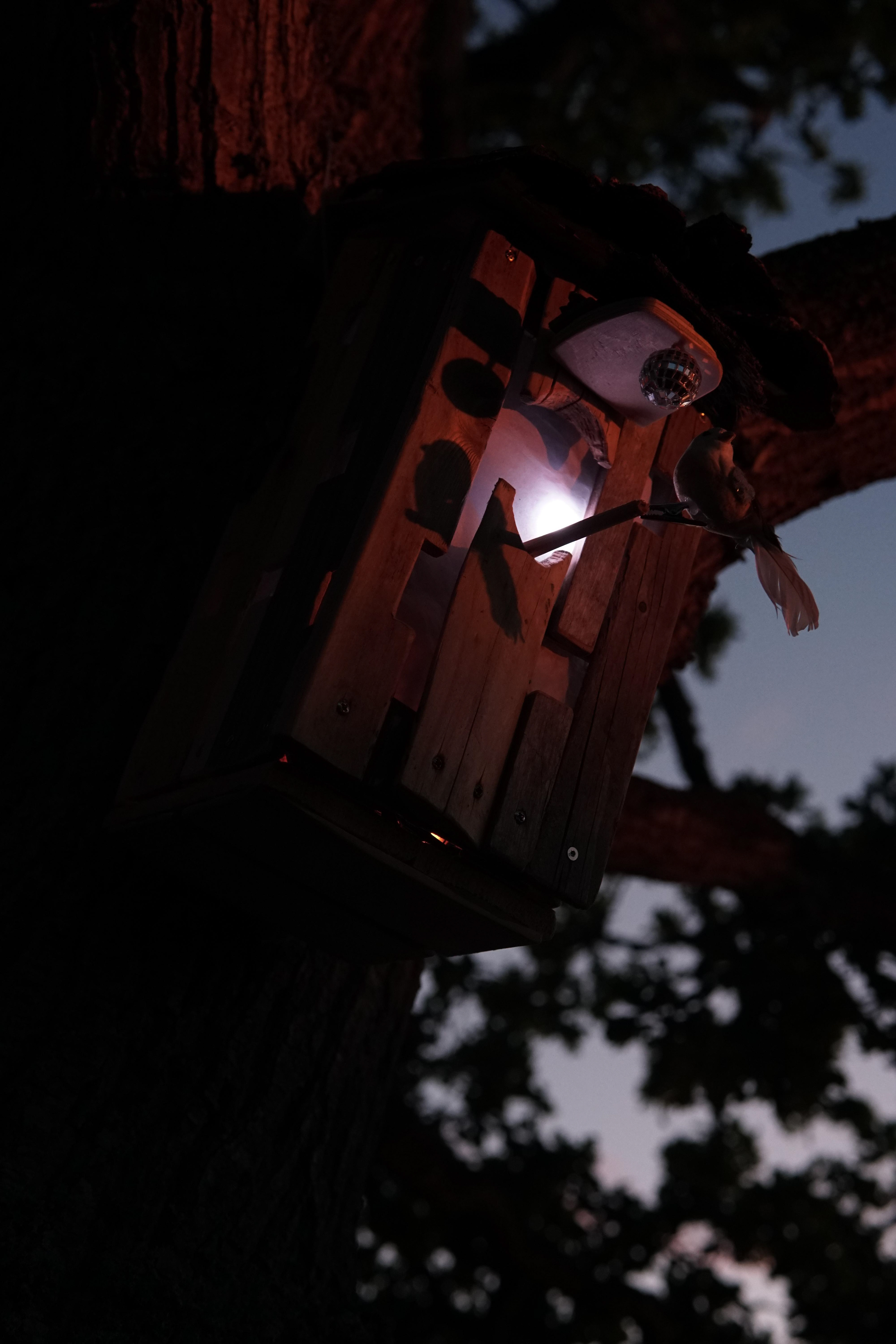 A backpacking-portable installation to surprise and delight the late-night partygoers at forest festivals. What looks like a nondescript bird house during daytime, will turn into an exciting nightclub of birds during nighttime.