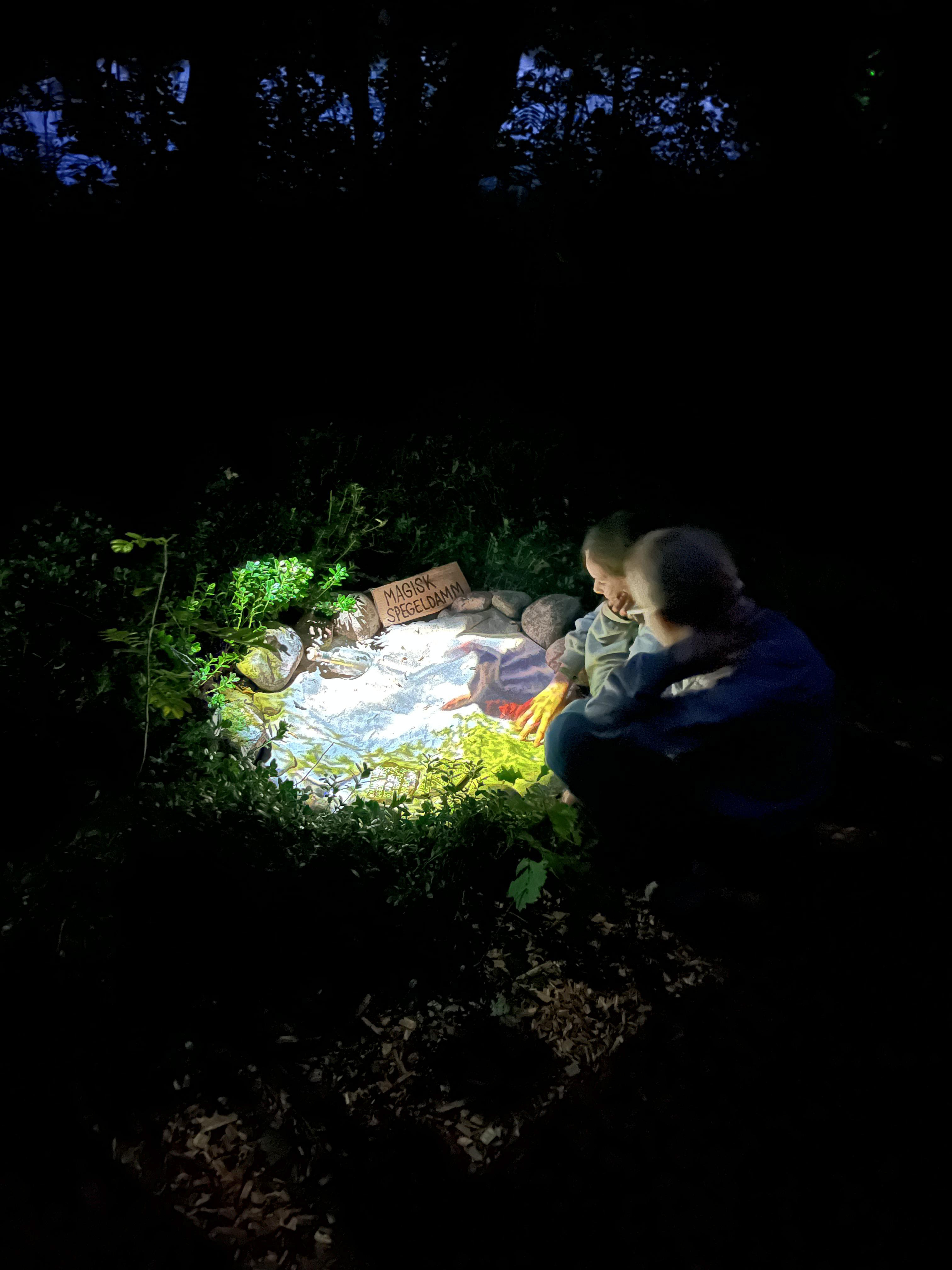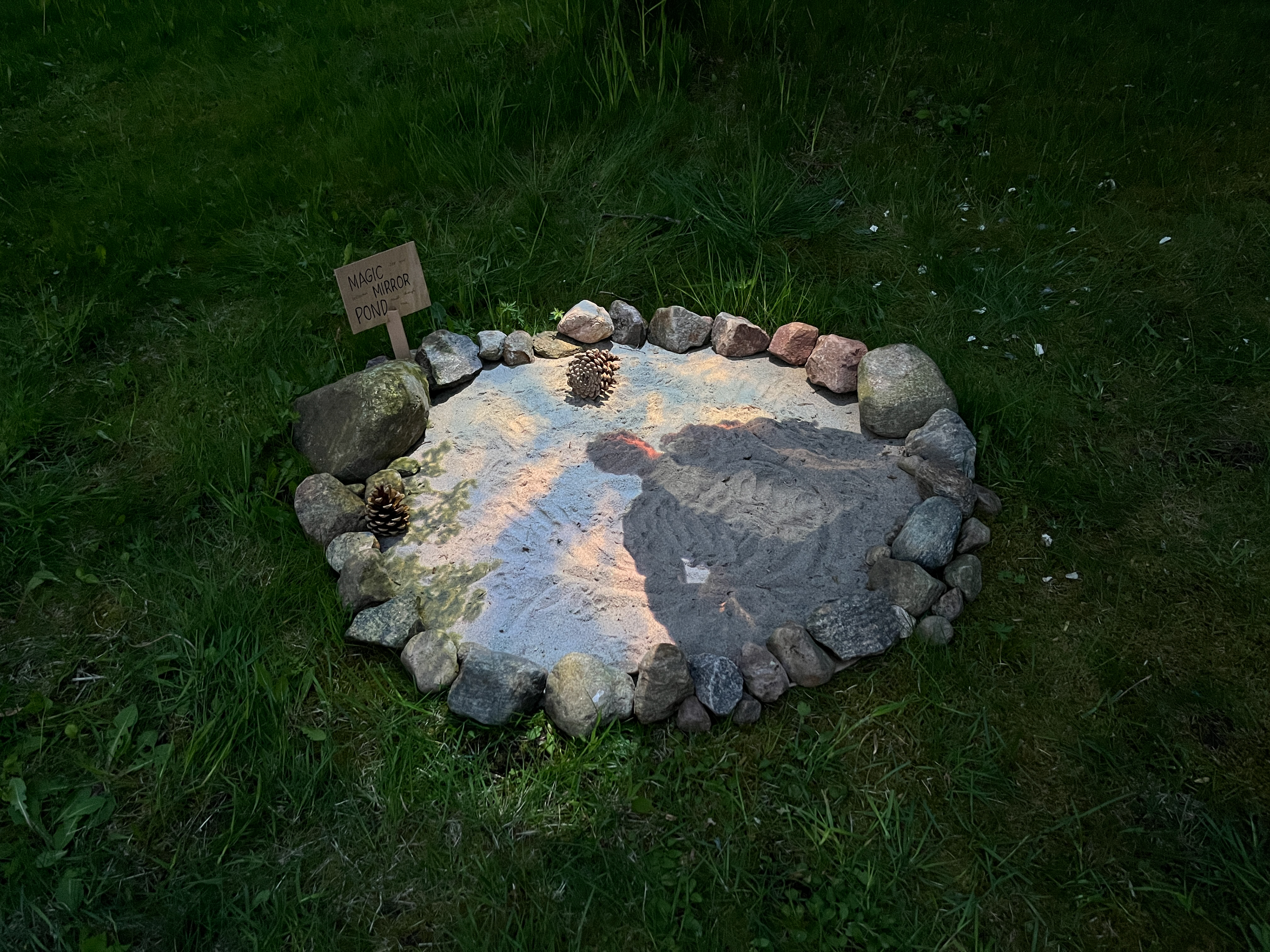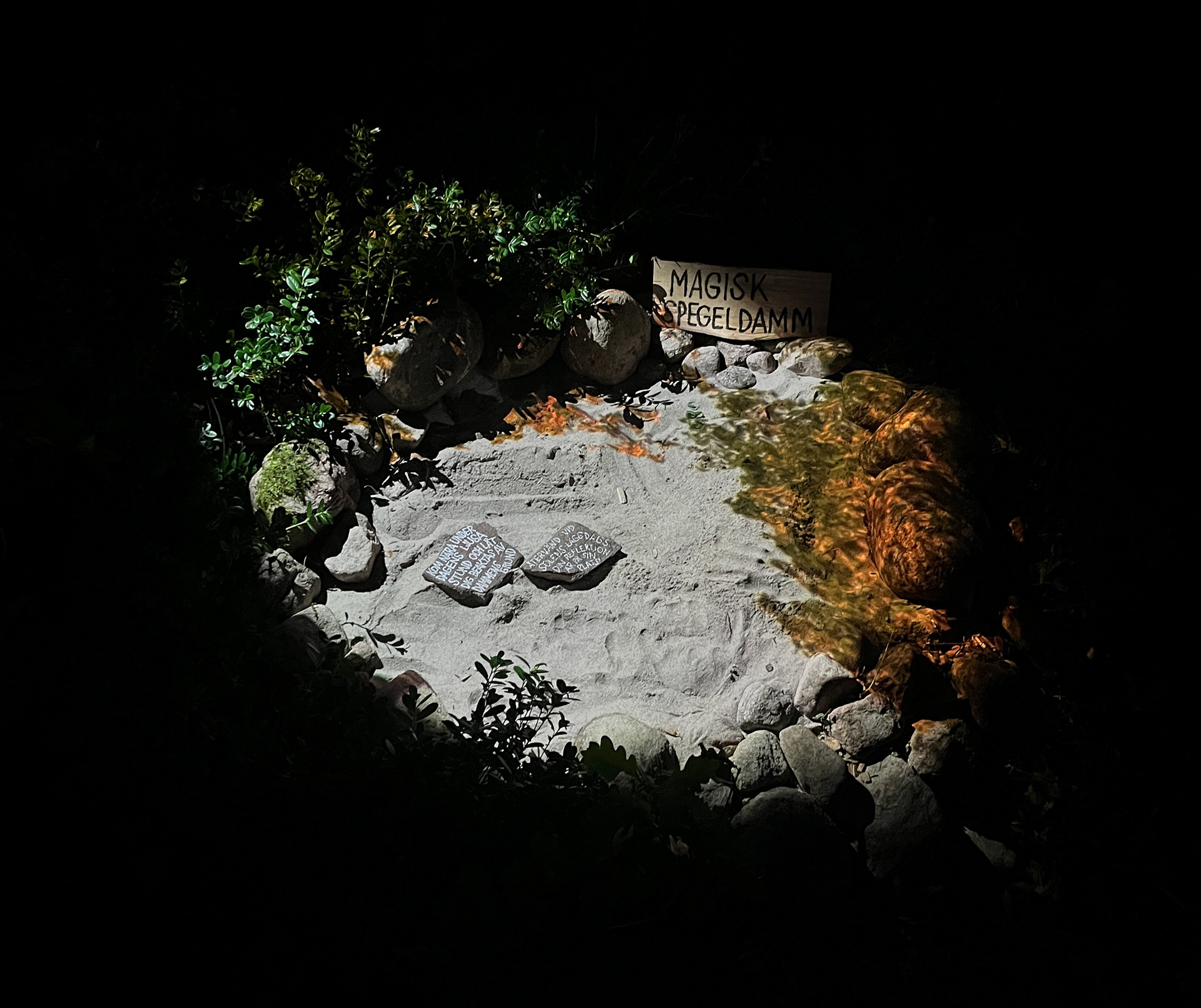 The magic mirror pond looks like just a sandy pond bed by day, but turns into a magical piece of projection art by night.